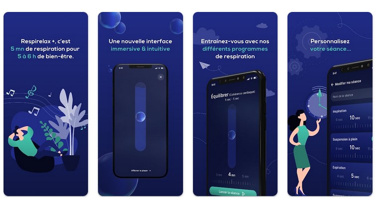 L’utilisateur suit un rythme visuel et sonore pour synchroniser sa respiration (inspiration / expiration), avec des séances personnalisables selon ses besoins (durée, rythme, ambiance).